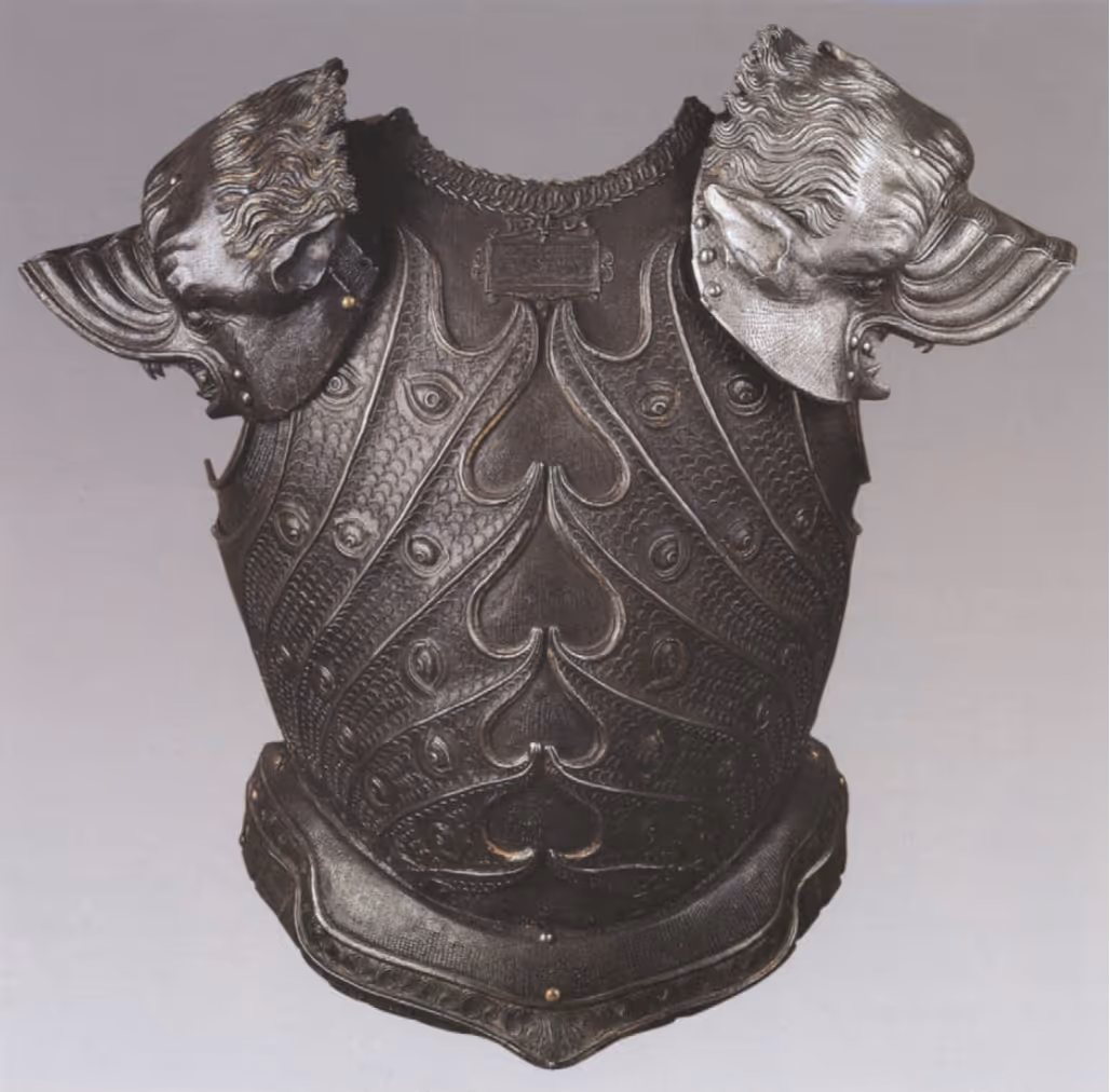 Armor of Guidobaldo il Della Rovere, Duke of Urbino. Breastplate, pauldron for the left shoulder and ooauldron for the right shoulder. Filippo Negroli. Milan, ca. 1532-35. Steel and gold. Museo Nazionale de Bargello, Florence (M. 772 - M. 778) and (right shoulder) The Metropolitan Museum of Art; Gift of William H. Riggs, 1913 (14.25.714i) Heroic Armor of the Italian Renaissance p. 136-144.