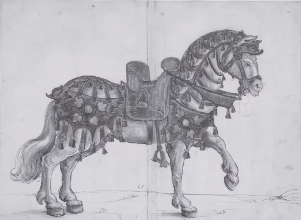 Possibly Hans Burgkmair the Younger (1500–62) (formerly attributed to Hans Burgkmair the Elder), Barded Horse, circa 1530–32, lead point, ink, and watercolor on paper, Thun-Hohenstein Album, Uměleckoprůmyslové museum v Praze (GK 11.572-B), folios 23v–24r. Prague. Source: The Thun-Hohenstein Album, p. 220.