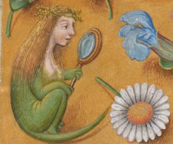 **“….**The flower-strewn border on a gold ground around the painting and text is typical of the Ghent and Bruges school with the addition of a drollery consisting of a reptile-like, zoo-anthropomorphic monster with a woman’s bust and head looking at itself in the mirror it holds.”