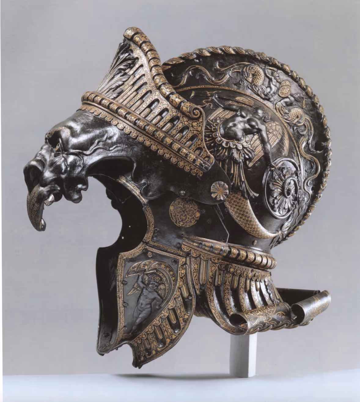 Burgonet “alla Romana Antica”. Milan, ca. 1550-55. Steel, gold, and brass. Hofjagd- und Rüstkammer des Kunsthistorischen Museums, Vienna (A693). Heroic Armor of the Italian Renaissance p. 204.