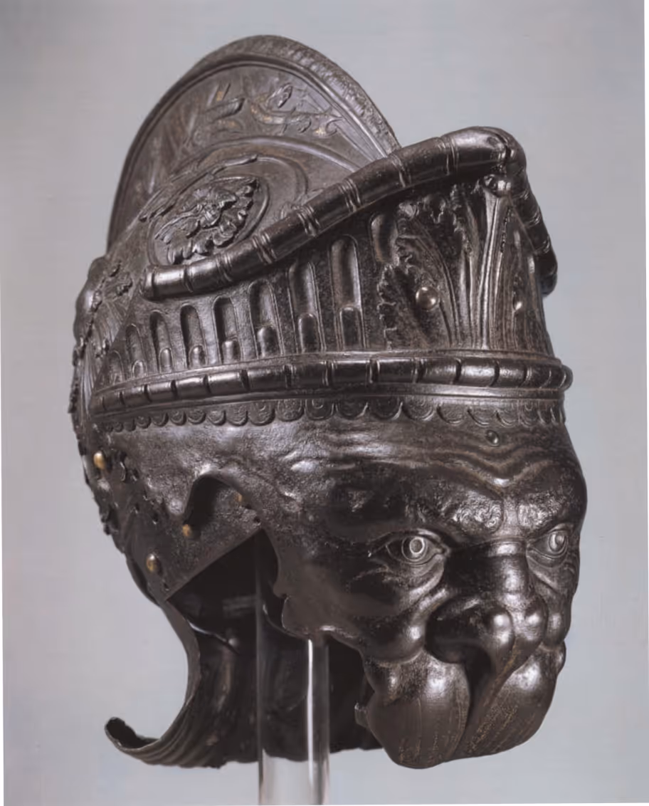 Burgonet “Alla Romana Antica”. Milan, ca. 1550-55. Steel, gold, and brass. Lent by the Syndics of the Fitzwilliam Museum, Cambridge (M. 19-1938). Heroic Armor of the Italian Renaissance p. 209.