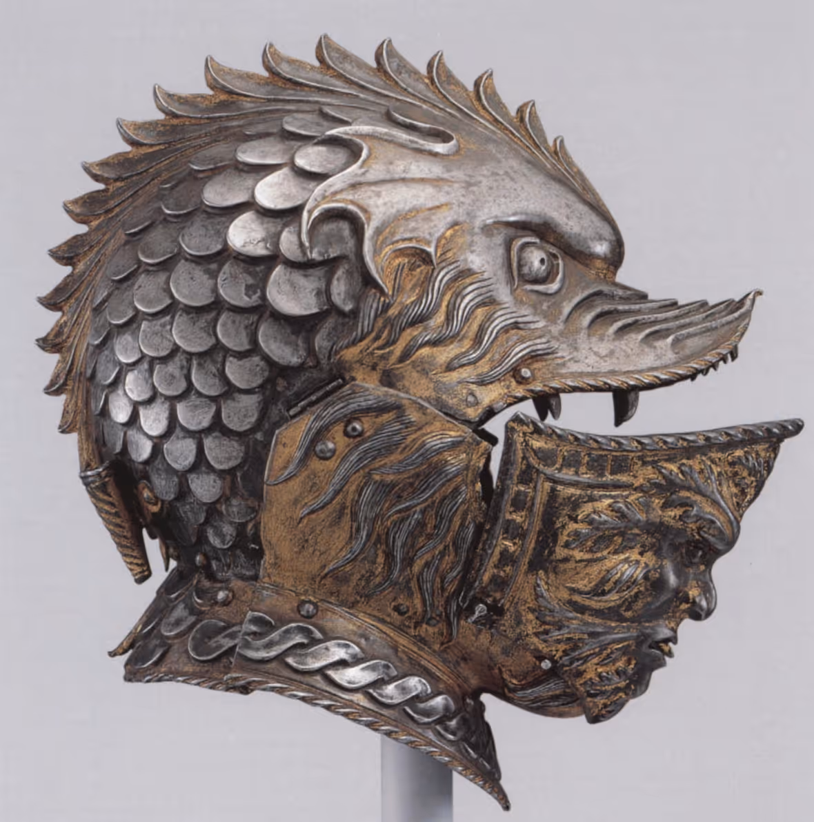 Burgonet and buffe. Milan, ca. 1540-45. Steel, gold, silver, and textile. Musée de l’Armée, Hotel National des Invalides, Paris (H. 149). Heroic Armor of the Italian Renaissance p. 300.