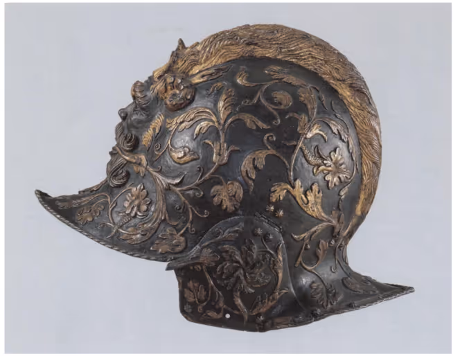 Burgonet of Henry II of France. Giovan Paolo Negroli. Milan, ca. 1545. Steel and gold. Musée du Louvre, Paris (MR.R.3). Heroic Armor of the Italian Renaissance p. 240.
