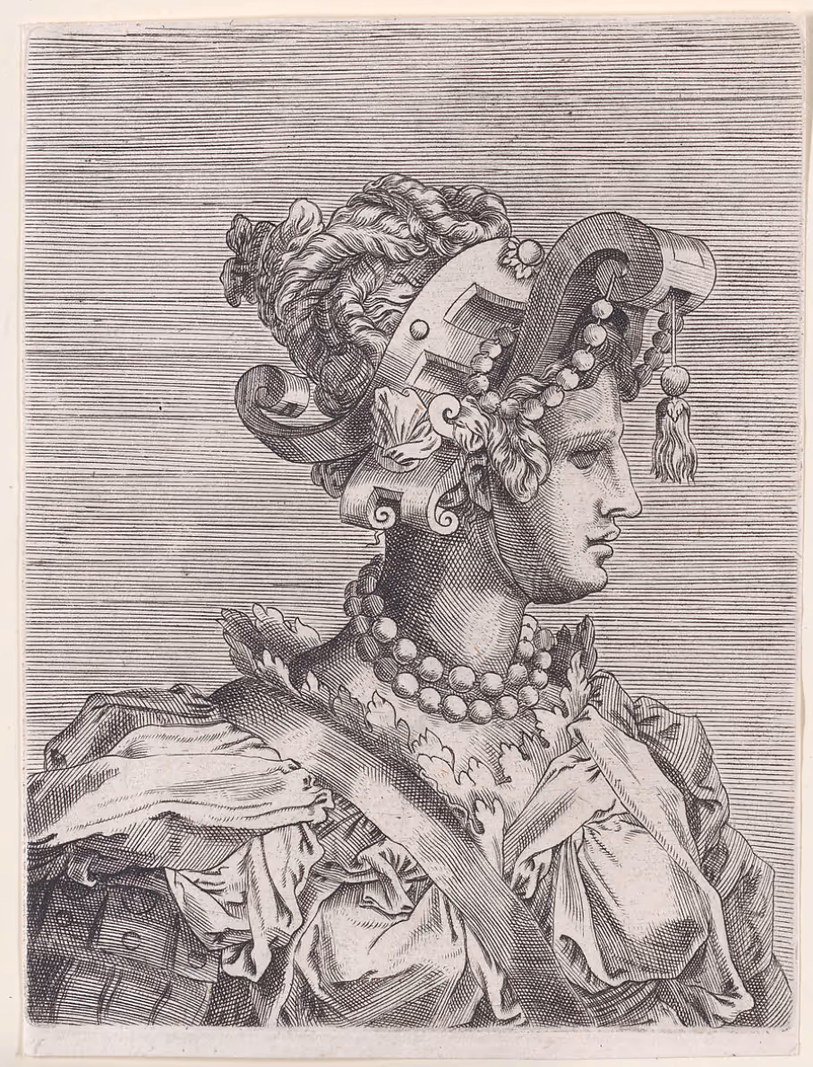 Bust of a Woman Wearing a Fantastic Head-dress and Mask. Set of 6 masquerade coiffures. René Boyvin (French, Angers ca. 1525–1598 or 1625/6 Angers). After Rosso Fiorentino (Italian, Florence 1494–1540 Fontainebleau). Etching. Source The Met Museum