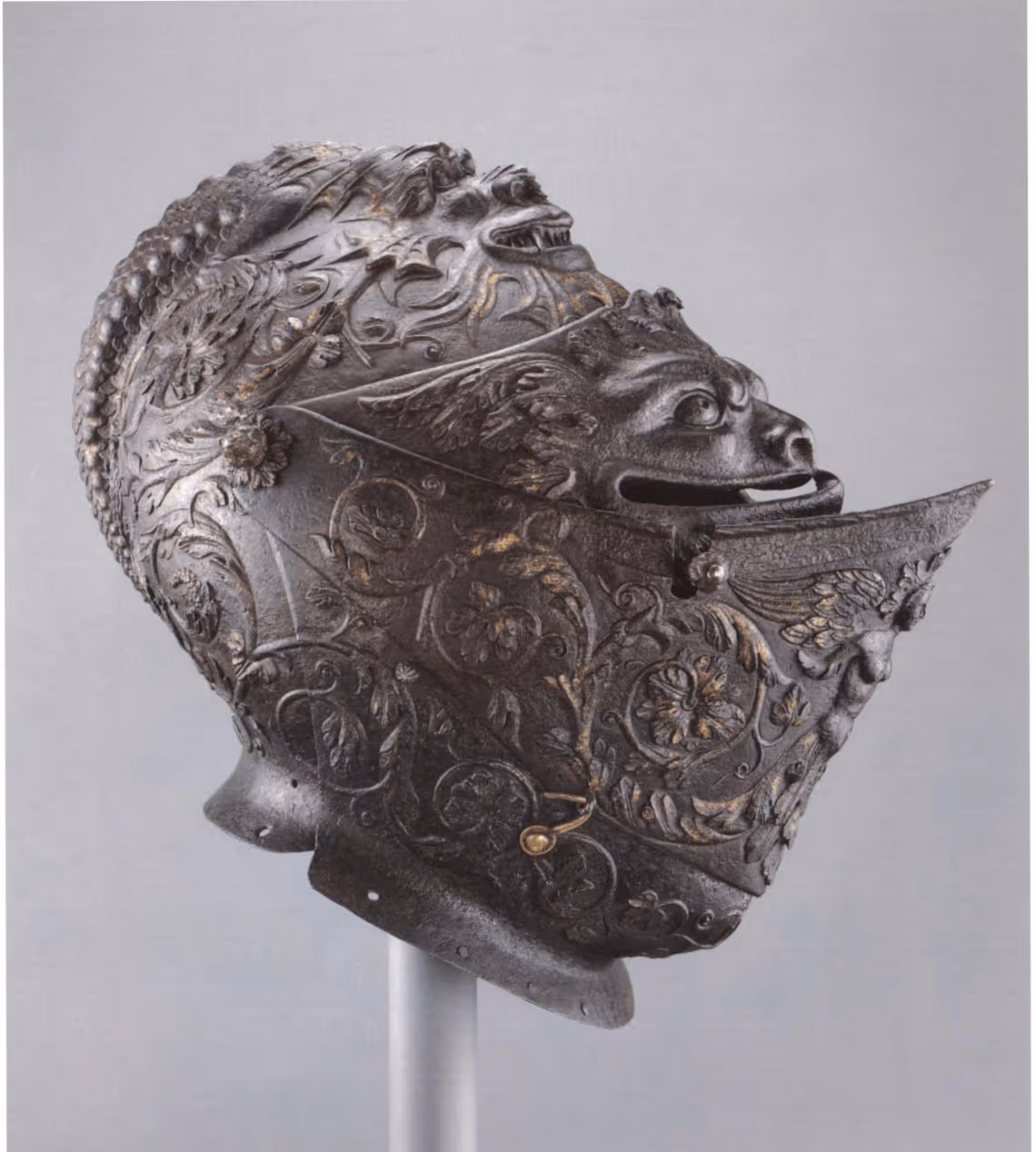 Close helmet. Giovan Paolo Negroli. Milan, ca. 1540-45. Steel and gold. The Metropolitan Museum of Art; Rogers Fund and Gift of George D. Pratt, 1926 (26.33). Heroic Armor of the Italian Renaissance p. 235.
