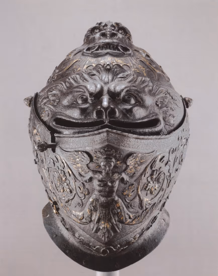 Close helmet. Giovan Paolo Negroli. Milan, ca. 1540-45. Steel and gold. The Metropolitan Museum of Art; Rogers Fund and Gift of George D. Pratt, 1926 (26.33). Heroic Armor of the Italian Renaissance p. 235.