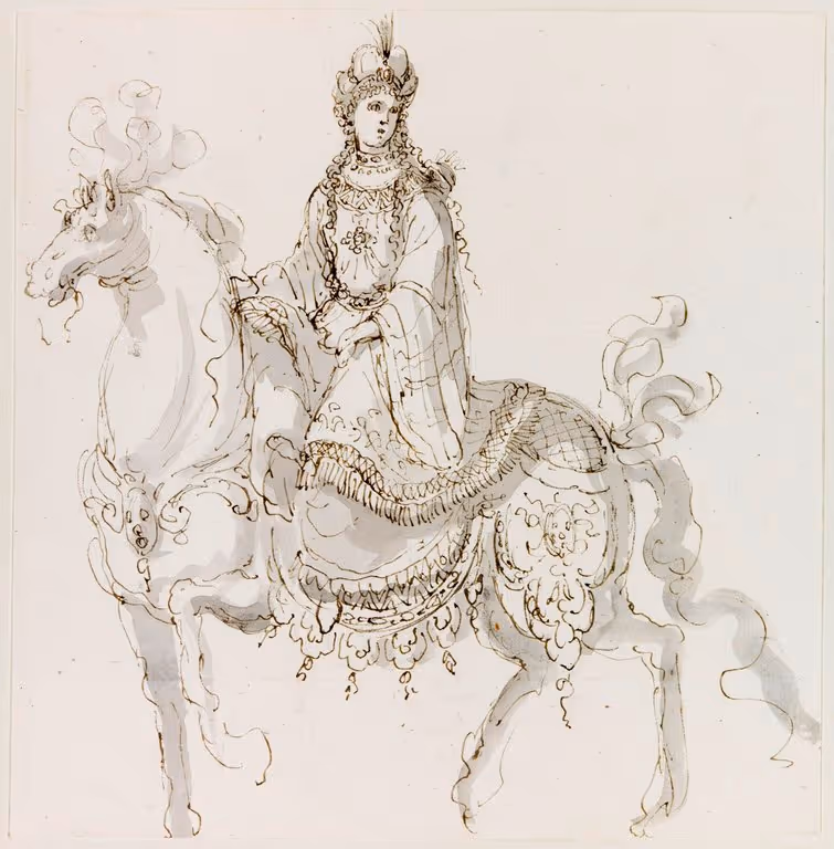 Costume de cavalière à la grecque pour le « Carrousel d'Alexandre et de Thalestris ». 1686. Jean I Berain. 3078 DR/ Recto, Département des Arts graphiques, Musée du Louvre, Paris.