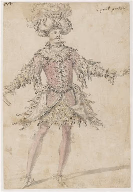 Costume de Cyrus pour Louis XIV à la huitième entrée du « Ballet des Muses ». 1666. Henri Gissey. 1723 DR/ Recto, Département des Arts graphiques, Musée du Louvre, Paris.