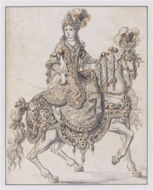Costume de Persane pour Mademoiselle de Bourbon en Orithye dans le « Carrousel d'Alexandre et Thalestris ». 1686. Jean I Berain. 1554 DR/ Recto, Département des Arts graphiques, Musée du Louvre, Paris.