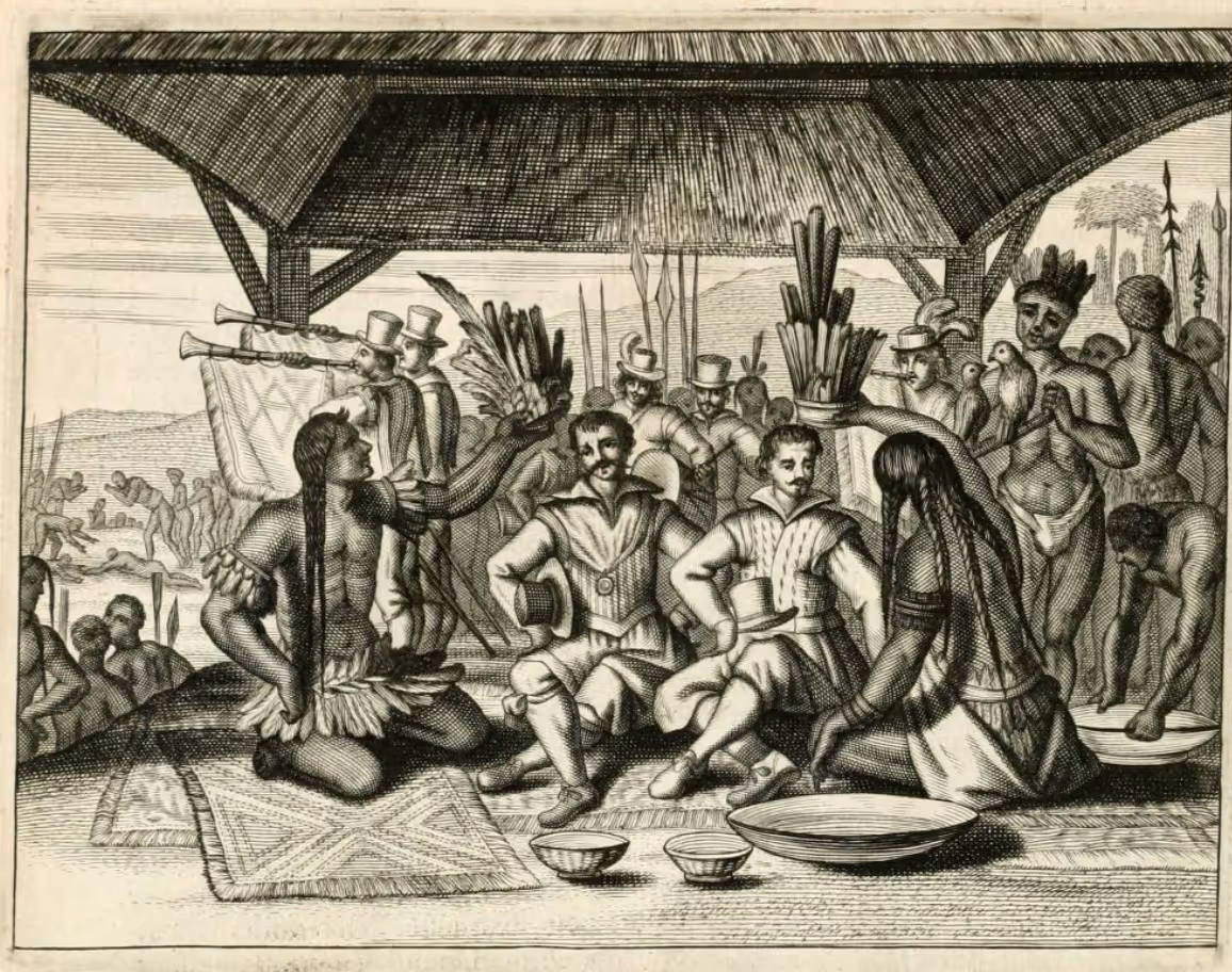 De nieuwe en onbekende weereld, of, Beschryving van America en 't zuid-land : vervaetende d'oorsprong der Americaenen en zuid-landers, gedenkwaerdige togten derwaerds, gelegendheid der vaste kusten, eilanden, steden, sterkten, dorpen, tempels, bergen, fonteinen, stroomen, huisen, de natuur van beesten, boomen, planten en vreemde gewasschen, Gods-dienst en zeden, wonderlijke voorvallen, vereeuwde en nieuwe oorlogen: verciert met af-beeldsels na 't leven in America gemaekt. 1671. by Montanus, Arnoldus, 1625?-1683; Meurs, Jacob van, 1619-1680. p. 110 Source