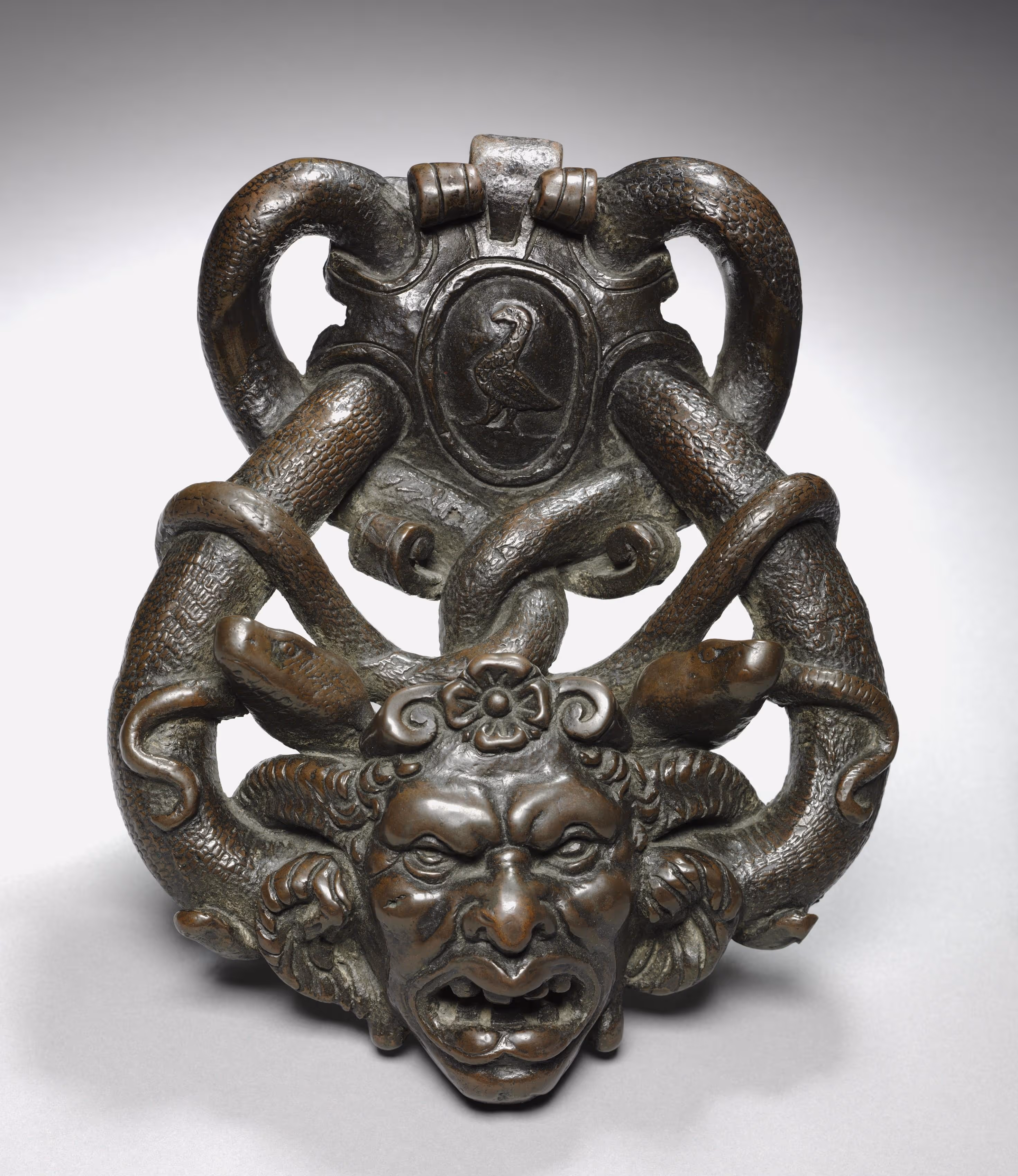 Doorknocker with Gorgon Head. mid 1500s. Bronze, Overall: 25.4 x 19.7 x 6.9 cm (10 x 7 3/4 x 2 11/16 in.). The Cleveland Museum of Art; Cleveland, Ohio, USA; Collection: Sculpture; Department: European Painting and Sculpture; Gallery: 118 Italian Renaissance; Provenance: description: Robert Mayer (Vienna, Austria), sold through the Paul Drey Gallery (New York, New York) to the Cleveland Museum of Art, 1972.; footnotes: None; date: None; Purchase from the J. H. Wade Fund. https://jstor.org/stable/community.24613158.