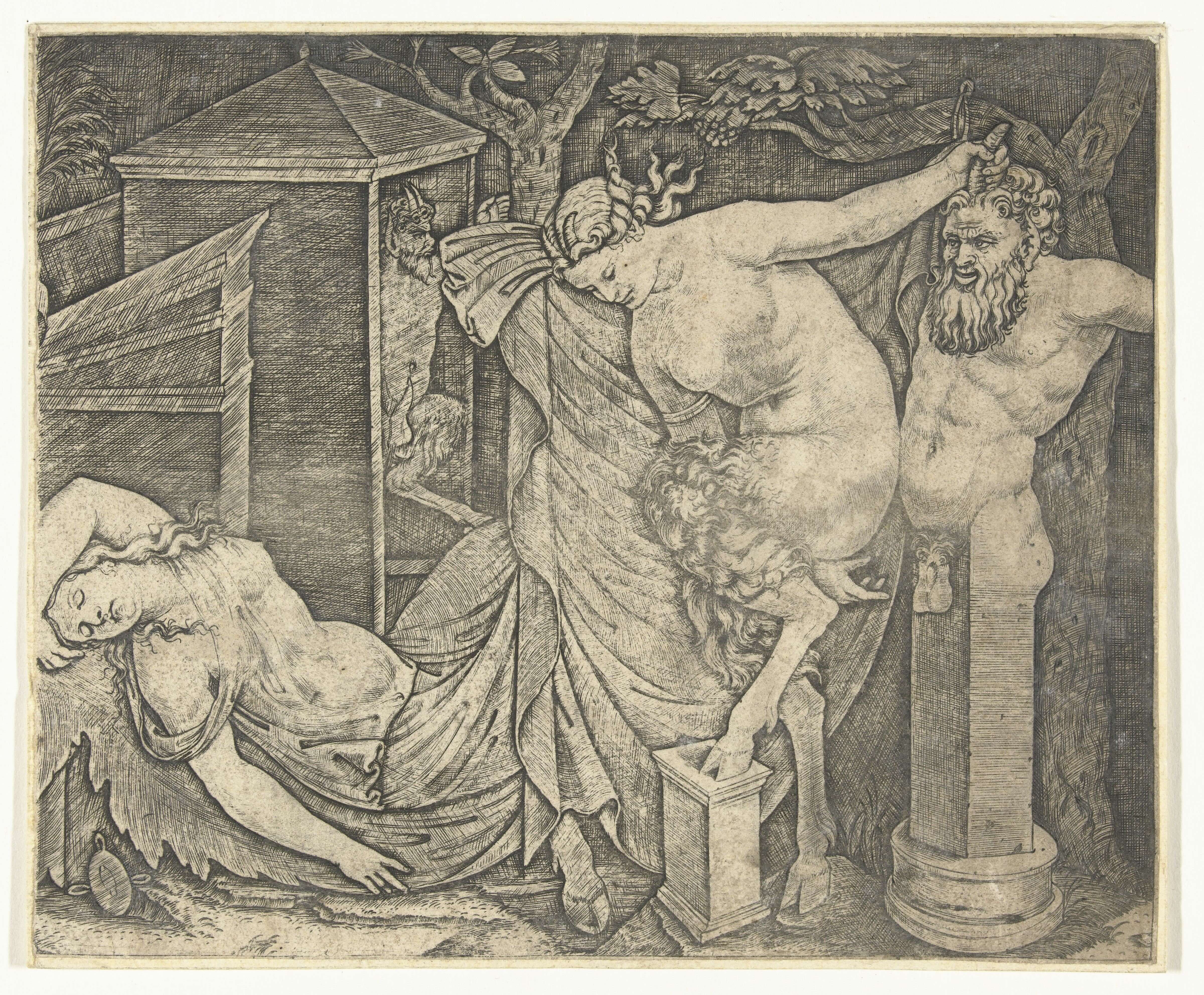 Fragment van bacchanaal met satervrouw en herme en slapende bacchante, Marcantonio Raimondi, after Rafaël, 1510 - 1527. Source Rijksmuseum