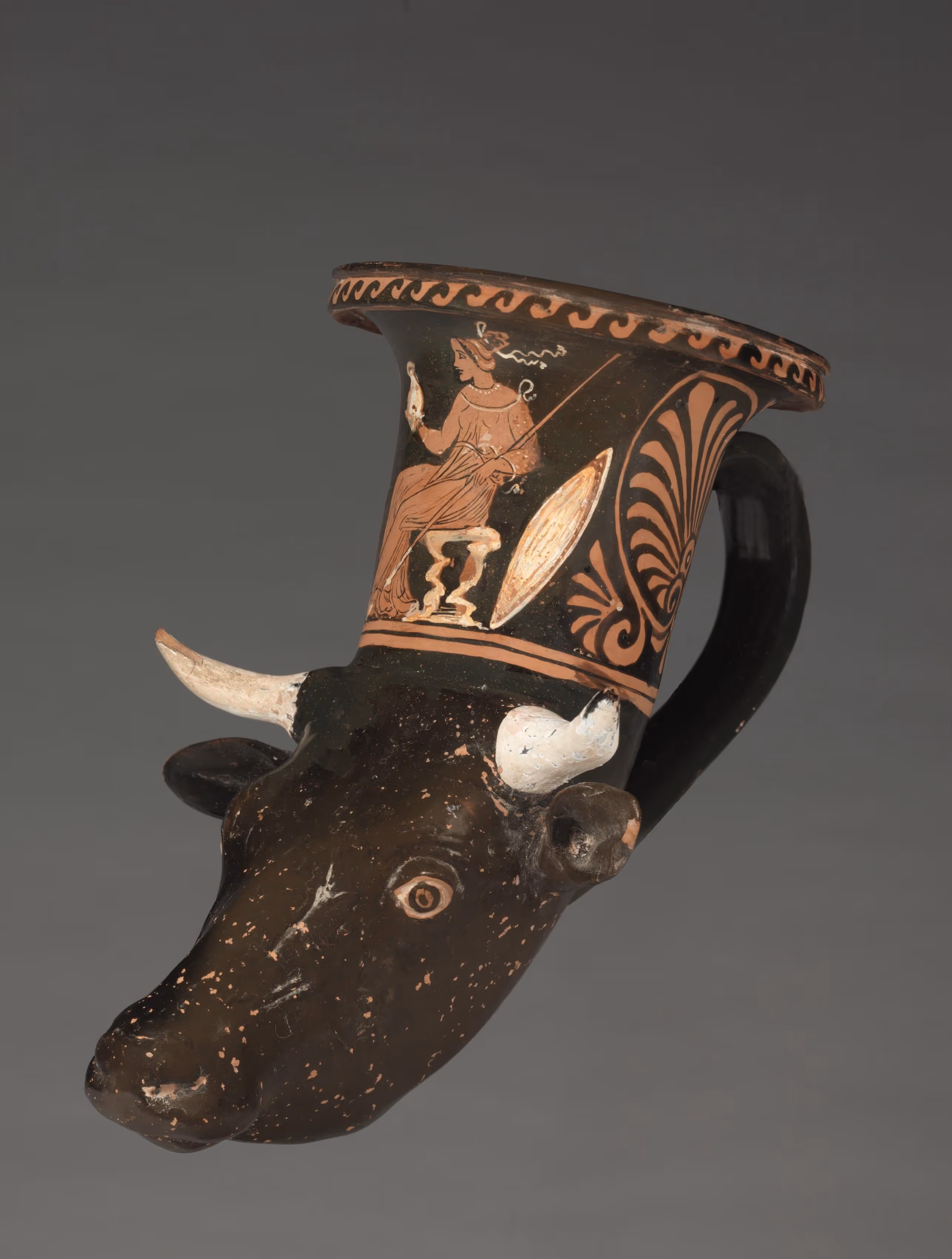 “Rhyta (drinking horns) in the forms of animal heads were popular ceramic products in Apulia c. 350-320 BC. Mold-made heads were attached to wheel-made bowls, with separately made handles (plus ears and horns, for this cow). On the bowl, a seated woman holds a helmet and spear, with a shield nearby; she may represent Athena, although the helmet differs from her usual type and she does not appear to wear her snaky aegis (breastplate).”