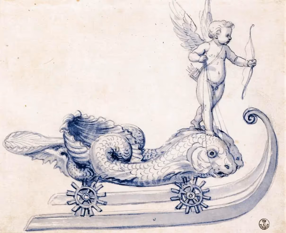 Guiseppe Archimboldo, Sleigh with Cupid and fish, 1585, Uffizi, Gabinetto dei Desegni e delle Stampe.