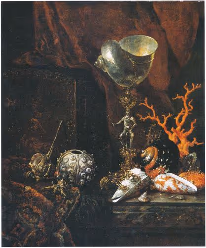 Stilleven met schelpenbeker, schelpen, koraal en kisje van lakwerk, Willem Kalf, ca. 1653. Source RKD