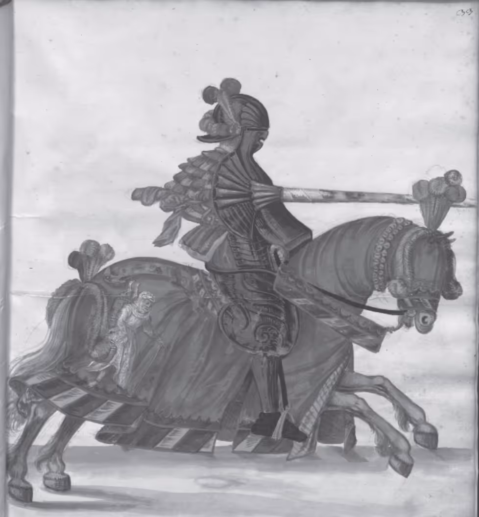 Unknown Augsburg Artist, rider in the Rennen (mock joust of war), in Turnierbuch Maximilians I, circa 1605–1615, lead point, ink, gouache, and metallic pigments on paper, Österreichische Nationalbibliothek (Cod. 10831 Han.), folio 33r. Vienna. © ÖNB. Source: The Thun-Hohenstein Album, p. 174.