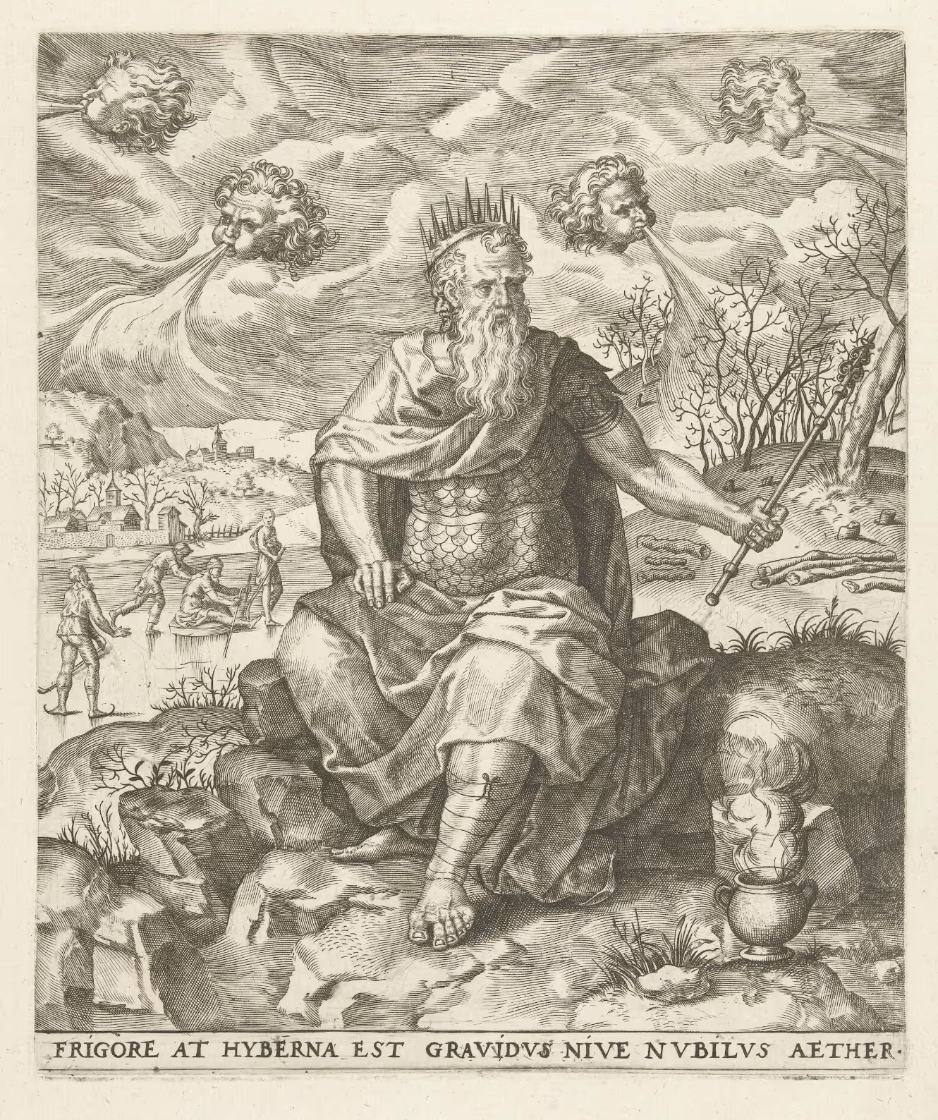 Winter: een koning met de vier winden, anoniem, naar Lambert Lombard, 1568.